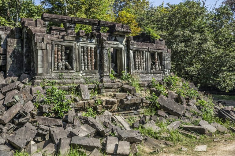 Next, proceed to Beng Mealea, a vast temple built by King Jayavarman VII in the style of Angkor Wat. Covering over one square kilometer and surrounded by a moat, Beng Mealea is approached by four causeways and appears as a massive, partially hidden ruin engulfed by trees. Constructed primarily of sandstone, the temple’s partially ruined state adds to its allure, making it one of the largest and most impressive temples of the Khmer Empire.