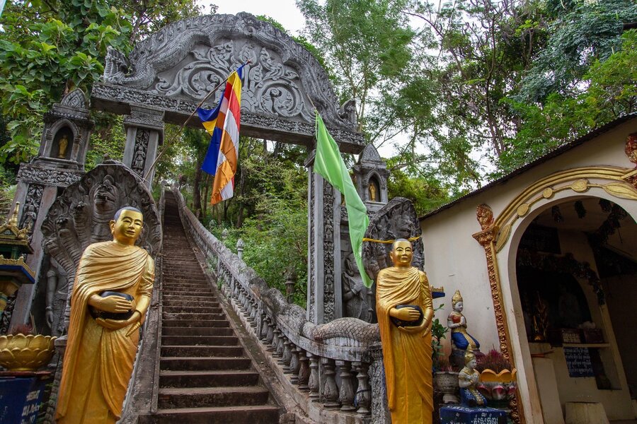 Travel by private vehicle along scenic back roads to Oudong, Cambodia’s former capital, located about 40 km from Phnom Penh. Along the way, you’ll pass through rural villages, local pagodas, and picturesque rice paddies before arriving at Oudong’s main hill. Ascend the stupa-covered hill for stunning views over the surrounding countryside.